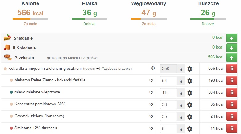 Wartość odżywcza kokardek z mięsem, obliczona przy pomocy Dziennika Kalorii: