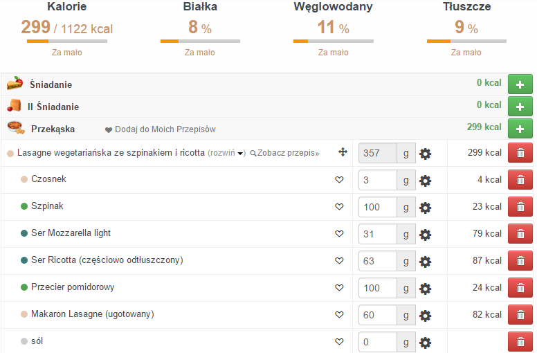 Wartość odżywcza lasagne wegetariańskiej ze szpinakiem i serem ricotta obliczona przy pomocy Dziennika Kalorii: