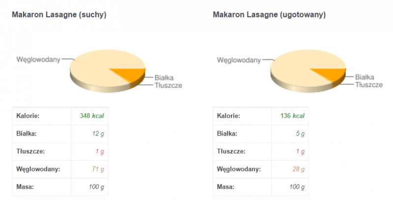Przeglądając wartości kaloryczne produktów, łatwo dojść do błędnego wniosku, że makaron jest bardzo kaloryczny. Dotyczy to jednak makaronu suchego. Podczas gotowania, chłonie on spore ilości wody i trzykrotnie zwiększa swoją wagę. Przykładowo, 100g makaronu lasagne przed ugotowaniem ma 348kcal, natomiast po ugotowaniu tylko 136kcal. Śmiało mogą więc włączyć go do diety osoby z nadwagą czy otyłością.