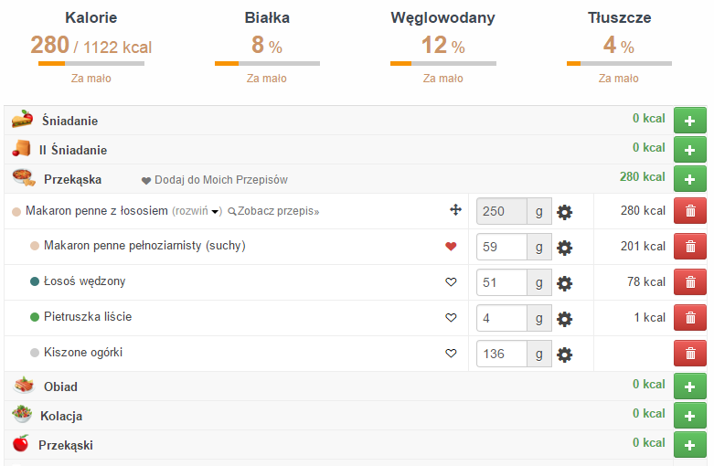 Wartość odżywcza makaronu penne z łososiem obliczona przy pomocy Dziennika Kalorii: