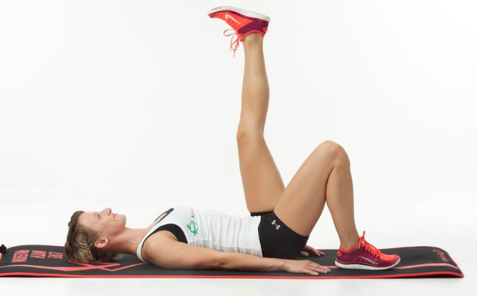 Połóż się na macie. Ręce powinny spoczywaj swobodnie wzdłuż Twojego tułowia. Jedną nogę podnieś do góry, zaś drugą zegnij w kolanie i oprzyj stopę o podłogę.
