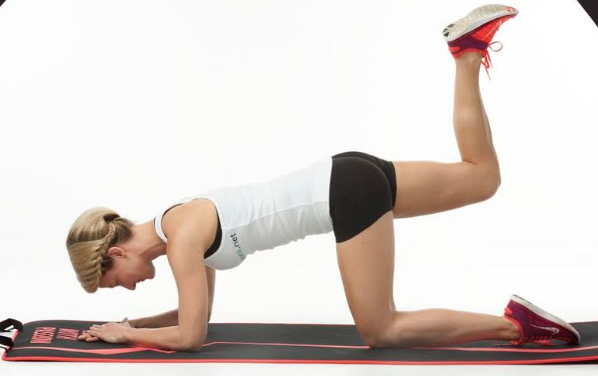 Uklęknij na macie. Ciężar ciała oprzyj na ugiętych przedramionach. Podnieś jedną nogę do góry, tak by stopa też była skierowana ku górze.