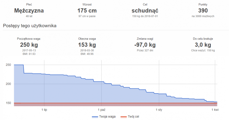 I tak Pan Janusz rozpoczął korzystanie z naszych usług. Najwyższa odnotowana przez niego masa ciała wyniosła 250 kilogramów, ale zaczęła stopniowo spadać. W czasie trzymiesięcznego stosowania spersonalizowanej diety online, układanej przez naszych dietetyków, mu udało się zrzucić pierwsze 16 kilogramów. Pan Janusz podsmował to krótko w przesłanej do nas wiadomości: