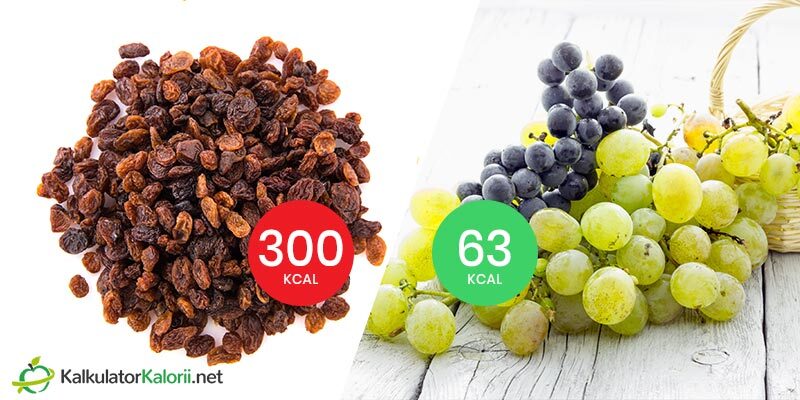 Porównaj, ile kalorii ma 100g rodzynek i świeżych winogron: