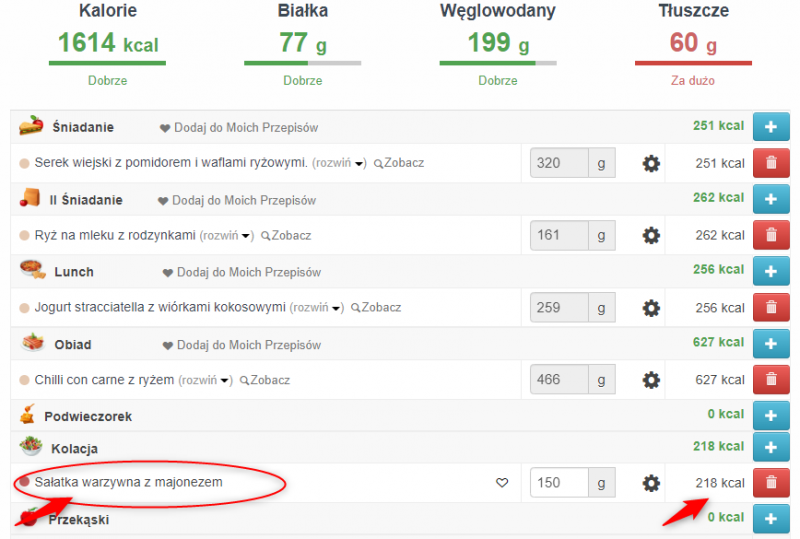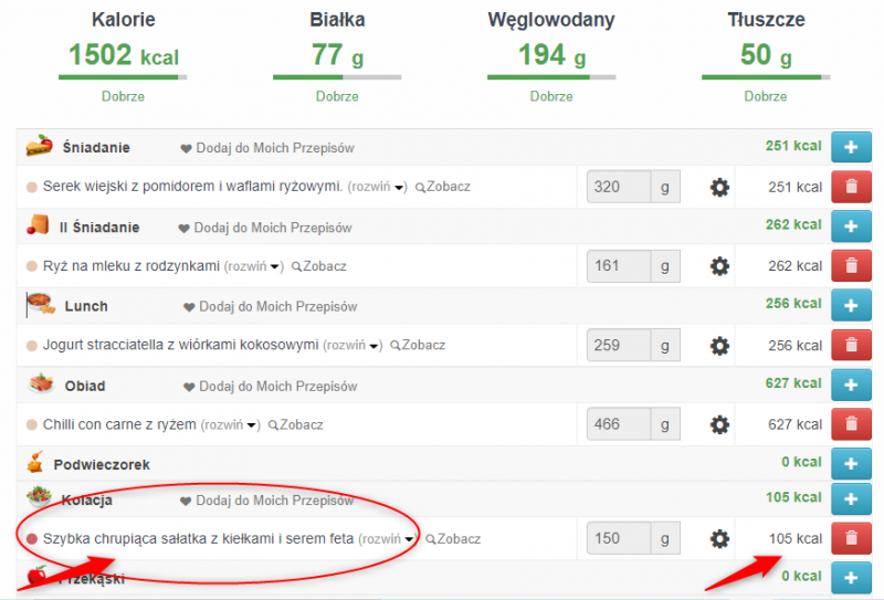 Zerknij na poniższe zrzuty ekranu z naszej aplikacji - Dziennika Kalorii. To całodzienny jadłospis jednego z naszych użytkowników. Wszystkie posiłki są takie same, poza kolacją. W pierwszej wersji na kolację została zaplanowana tradycyjna sałatka z majonezem, w drugiej dietetyczna sałatka z fetą.