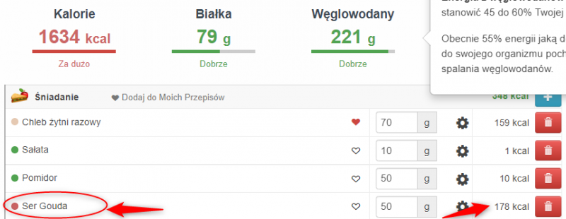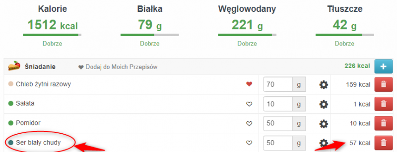 Widok z Dziennika Kalorii, w którym jedyną zmianą w całodziennym jadłospisie jest zamiana ser gouda na chudy ser twarogowy: