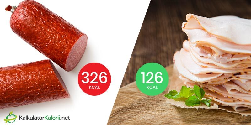 Zostając w temacie mięsa: czy zwracasz uwagę na wędliny, które wybierasz do kanapek? Jeśli jako dodatek wybierzesz chudą szynkę drobiową, zamiast suchej kiełbasy, to "zaoszczędzisz" około 200 kilokalorii na 100 g produktu. Gdy na Twojej kanapce co drugi dzień w ciągu miesiąca pojawia się, na przykład, 50 gram kiełbasy podsuszanej to możesz spożyć o 1500 kilokalorii więcej w ciągu miesiąca!. Koniecznie zobacz porównanie tych dwóch produktów, które zostało przygotowane za pomocą naszego przelicznika kalorii w potrawach.