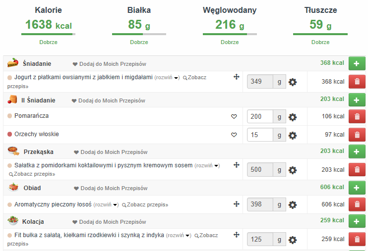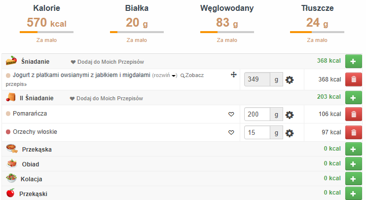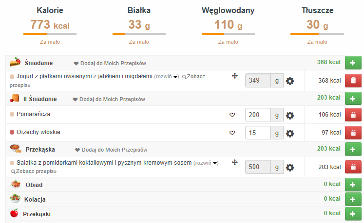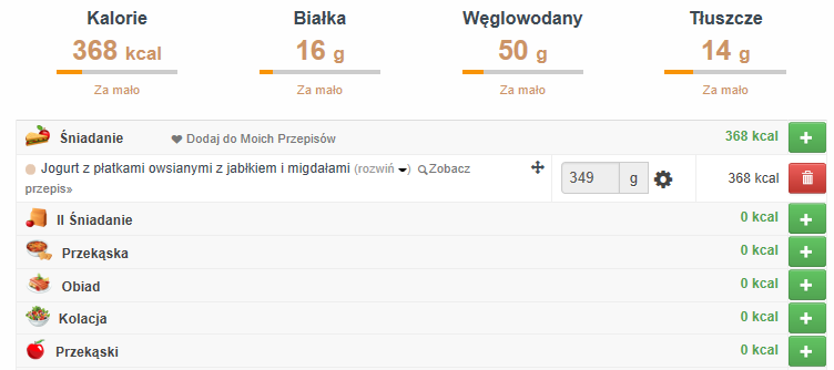 Obliczenia wykonywane są przy użyciu aplikacji Dziennik Kalorii. Zawartość kalorii, białek, węglowodanów i tłuszczów jest oznaczona jako zbyt niska. To nie błąd. W diecie zaplanowano dopiero jeden z 5 posiłków. Kolejne będą wzbogacać jadłospis o następne porcje tych składników. Po zaplanowaniu całego dnia, zawartość kalorii, baiłek, tłuszczów i węglowodanów powinna podświetlić się na zielono, co będzie oznaczać, że dieta została dobrze zbilansowana.
