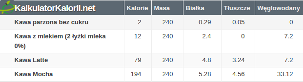 Czarna kawa pita z umiarem (maksymalnie 3 do 4 filiżanek dziennie) posiada korzystny wpływ na zdrowie, gdyż zawiera przeciwutleniacze. Kofeina nieznacznie stymuluje metabolizm i zwiększa spalanie kalorii oraz tłumi apetyt na krótką chwilę. Oczywiście nie można zapomnieć o zdrowej diecie, pilnowaniu indywidualnego limitu kalorycznego (który możesz sprawdzić w Kalkulatorze Odchudzania), gdyż picie kawy samo w sobie nie spowoduje utraty wagi. Jeżeli nie słodzisz swojej kawy i dodajesz ewentualnie niewielką ilość odtłuszczonego mleka, możesz bez przeszkód włączyć ten rodzaj napoju do swojej codziennej diety. Pamiętaj, że kawa z dodatkiem pełnotłustej śmietanki i/lub słodkiego syropu, może zawierać dużą ilość kalorii.