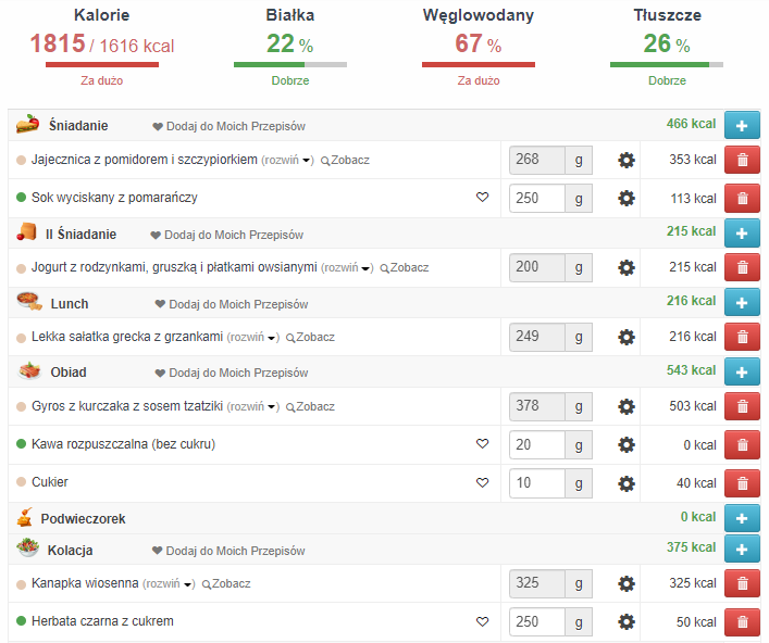 Czy ułożenie różnorodnego jadłospisu o trudne zadanie? Wbrew pozorom, wcale nie. Spójrz na poniższy zrzut ekranu z Dziennika Kalorii. Zaplanowana w nim dieta to proste, powszedchnie spożywane potrawy, z produktów dostępnych w każdym sklepie. Nie ma tu nic skomplikowanego. Nie ma żadnych egzotycznych dodatków.