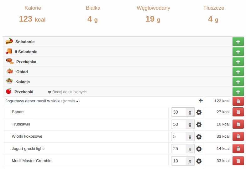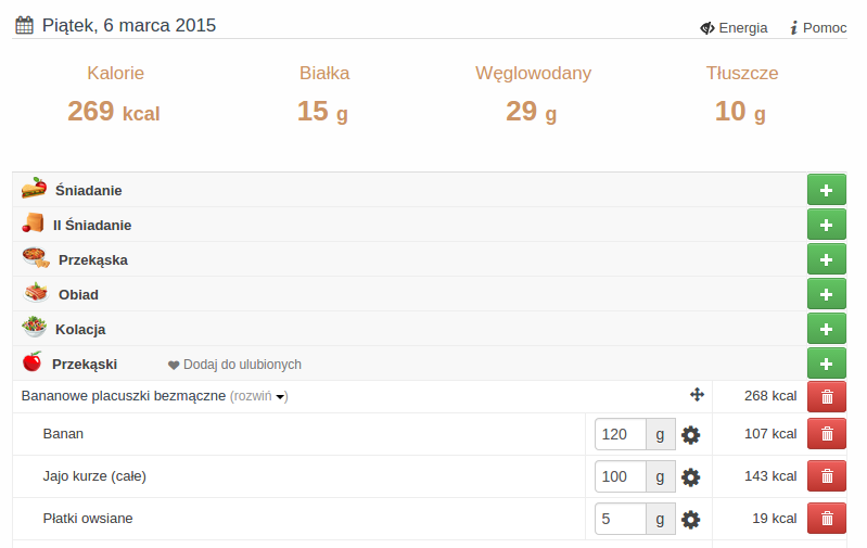 Do liczenia kalorii i rozkładu wartości odżywczych użyłam aplikacji Dziennika Kalorii.