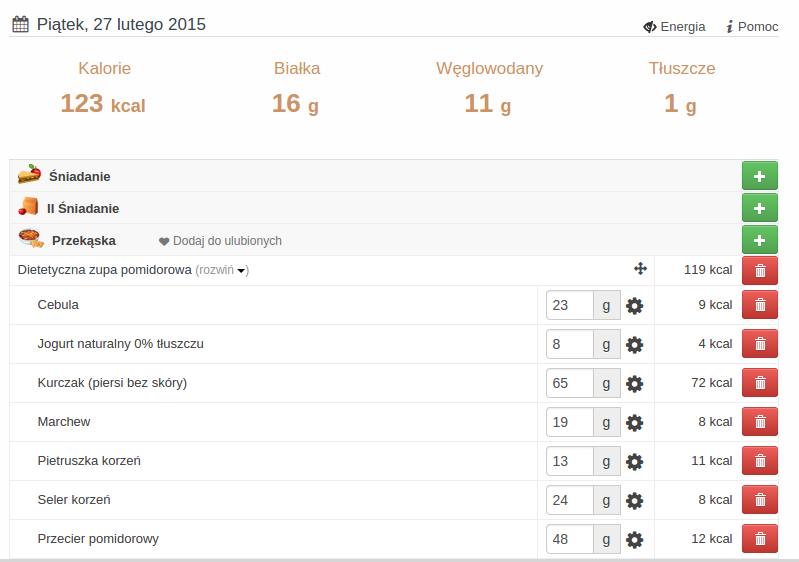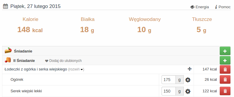 4. Wielkość Twojego posiłku i przekąski w ciągu dnia zależy od wielkości Twojego śniadania i czasu, w którym jesz obiad. Pomysłów na drugie śniadanie i przekąsek do obiadu jest bardzo dużo. Do liczenia kalorii oraz rozkładu wartości odżywczych użyłam aplikacji Dziennika Kalorii, których fragmenty zamieszczam poniżej: