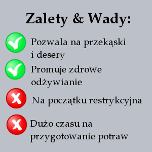 Wygoda: Posiłki w restauracji są wykonalne pod warunkiem, że trzymasz się zasad diety. Istnieje również dużo przepisów dostępnych w książce lub internecie na różne dania, jak i zdrowe desery dozwolone podczas tej diety.
